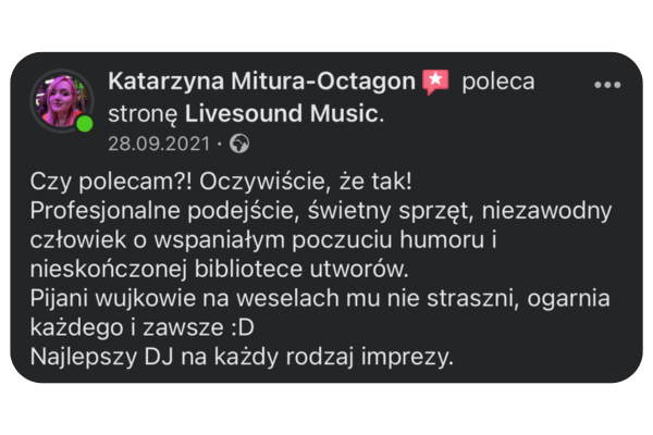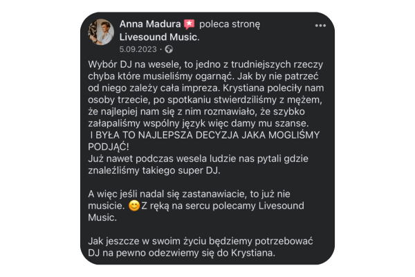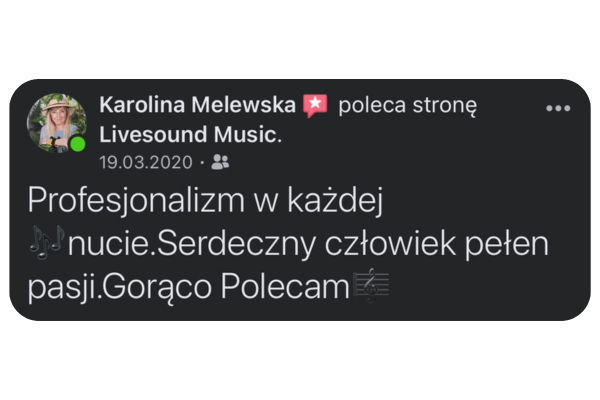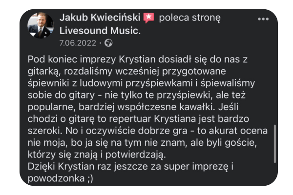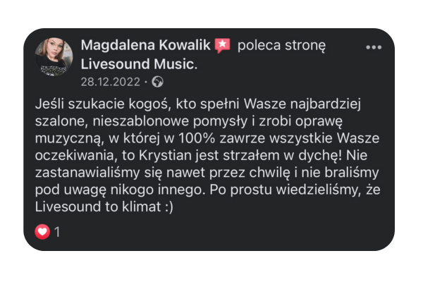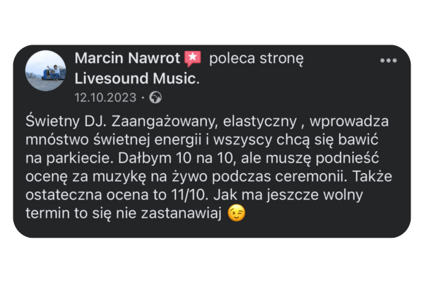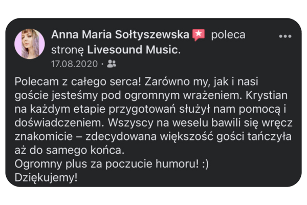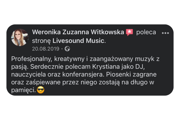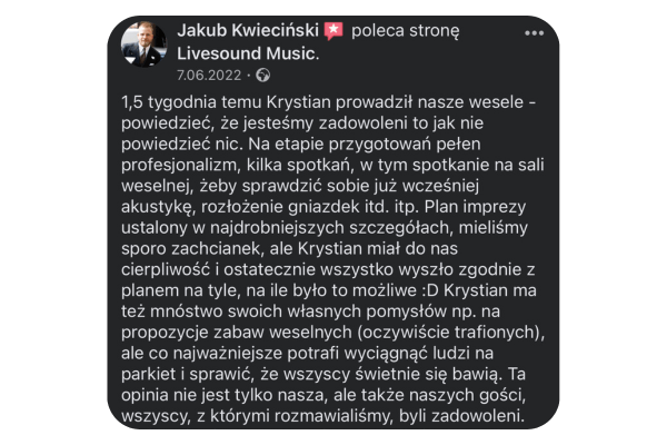 Cześć! Tu Krystian Jałoszyński. Muzyka to moja pasja i profesja. Jako założyciel „Livesound”, codziennie dbam o to, aby muzyka na każdym wydarzeniu była niezapomniana. Zajmuję się prowadzeniem i oprawą muzyczną wszelkiego rodzaju imprez, wesel, spotkań biznesowych – gwarantuję oprawę muzyczną, która zmienia dobre imprezy w niezapomniane przeżycia.